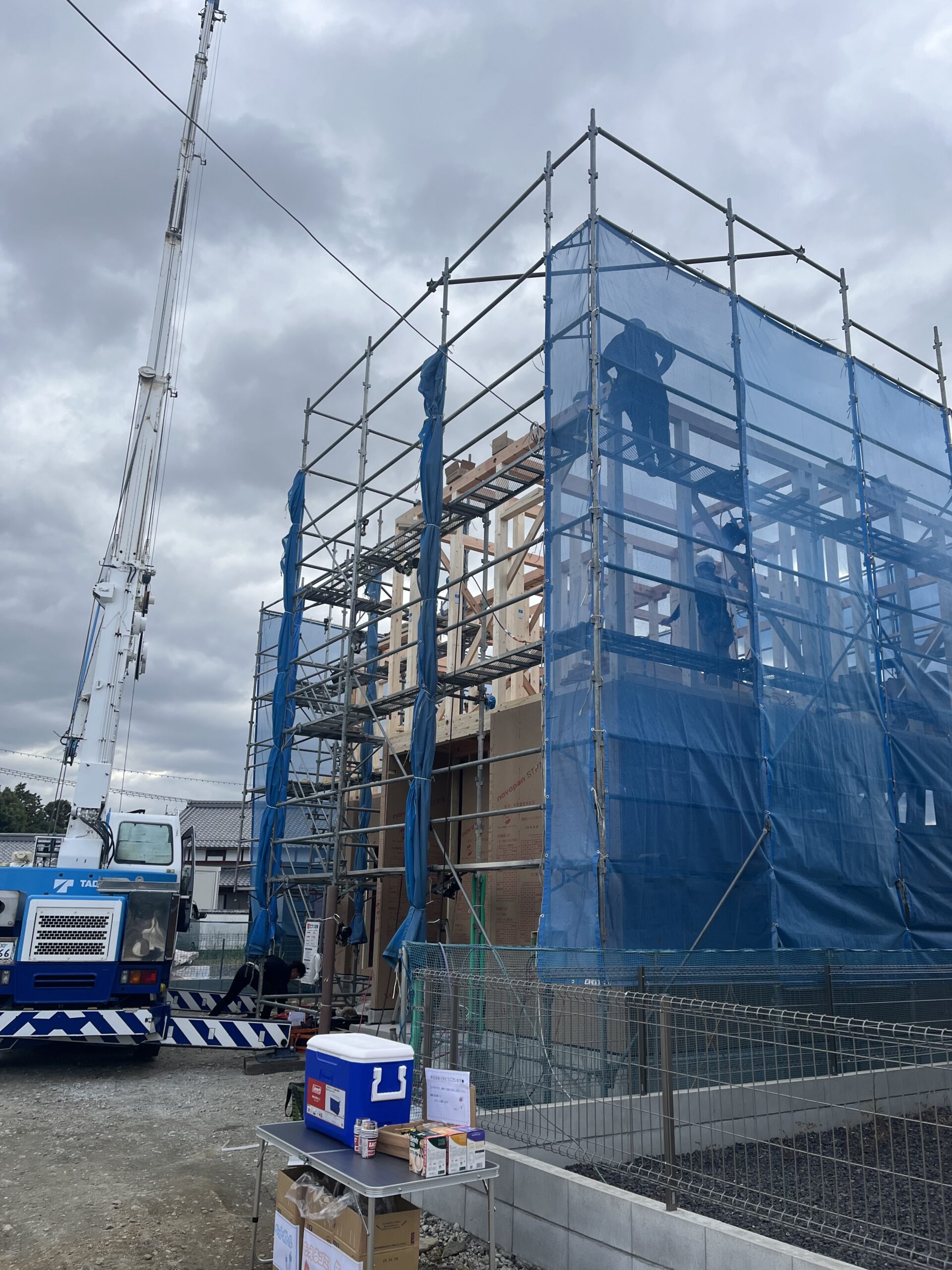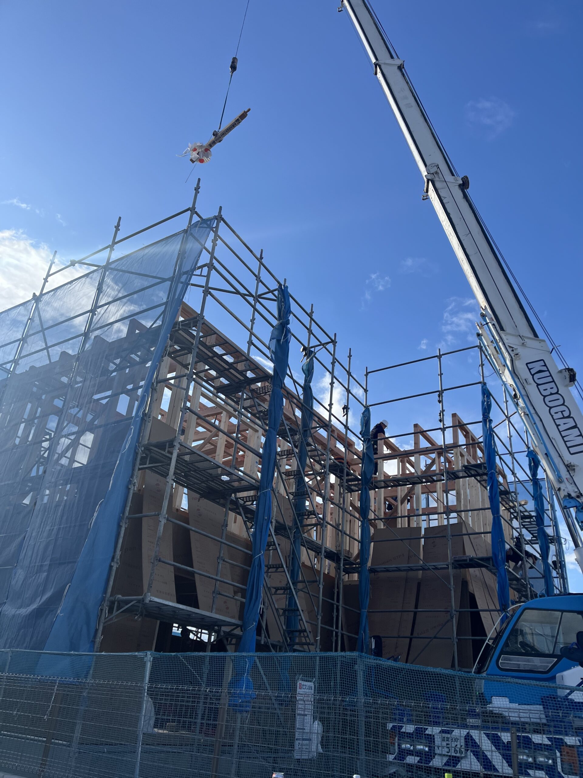当日少し薄曇りの中、野洲比留田町で上棟を行いました。