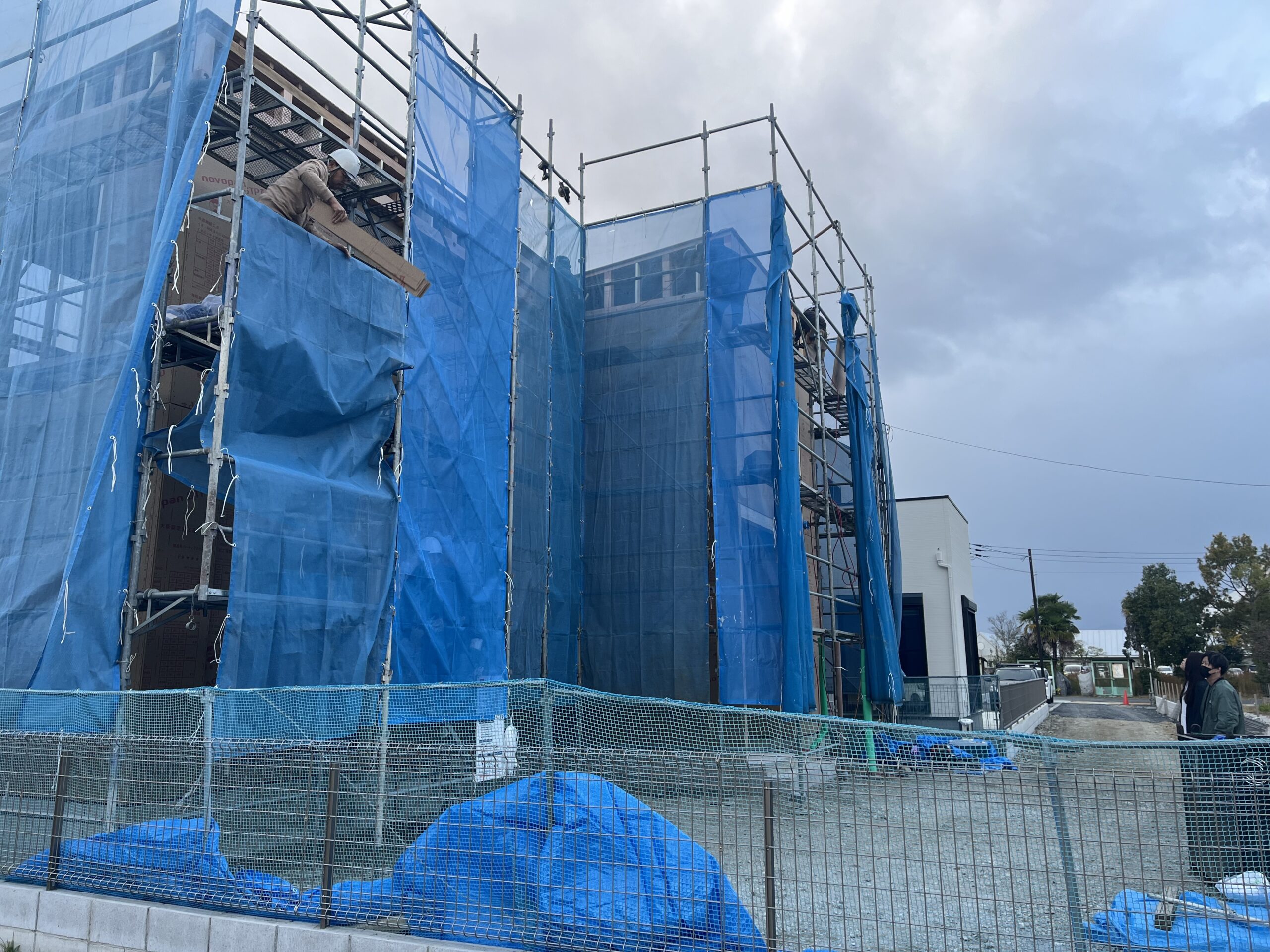 本日の工事の終盤建物を感慨深く見つめる施主様ご夫婦。