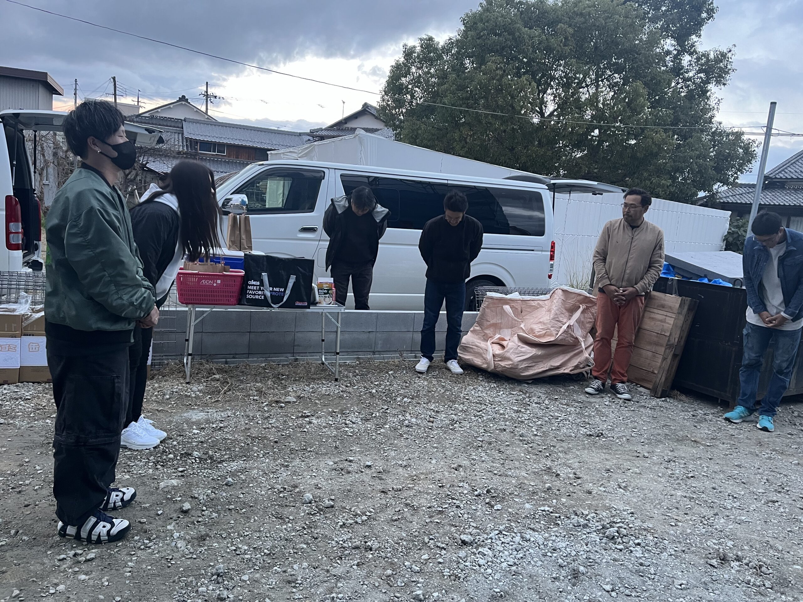 施主様から「朝早くから僕たちのためにご参加いただきありがとうございます。お弁当を用意させて頂きましたので、お召し上がり頂いて、午後からもお怪我のないよう安全第一でよろしくお願いいたします。」
