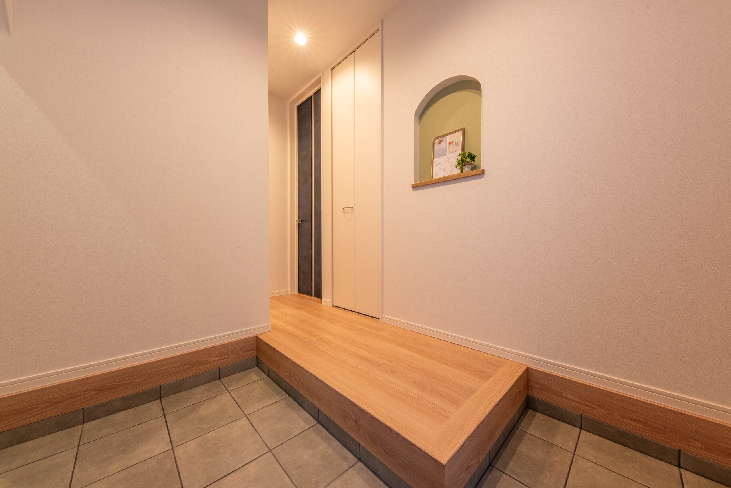 玄関は家に入ったときに最初に目にする場所です。ここにニッチを設けることで、インテリアとしての役割を持たせつつ、実用的な機能も加えられます。例えば、鍵やハンコなどの小物を収納するスペースや、家族写真や季節ごとの飾りをディスプレイするスペースとして活用できます。
