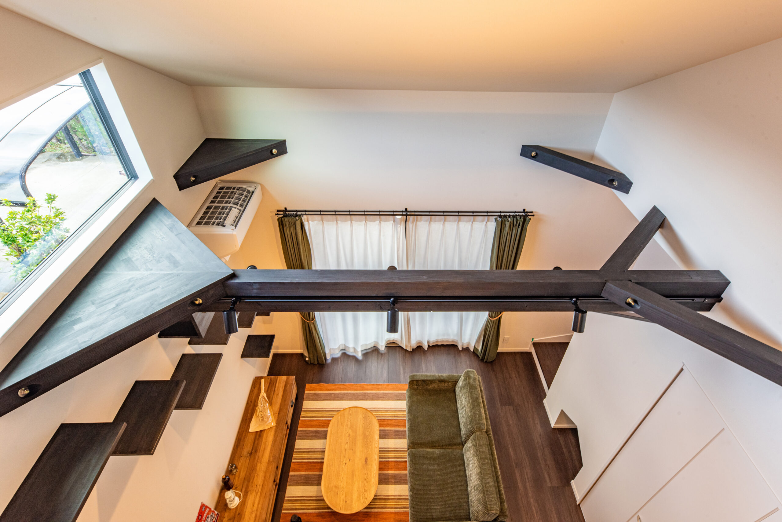 青空を背景に趣味を最大限に活かしたコテージのような暮らしを楽しめる半平屋。ロフトから臨むリビングは圧巻です。