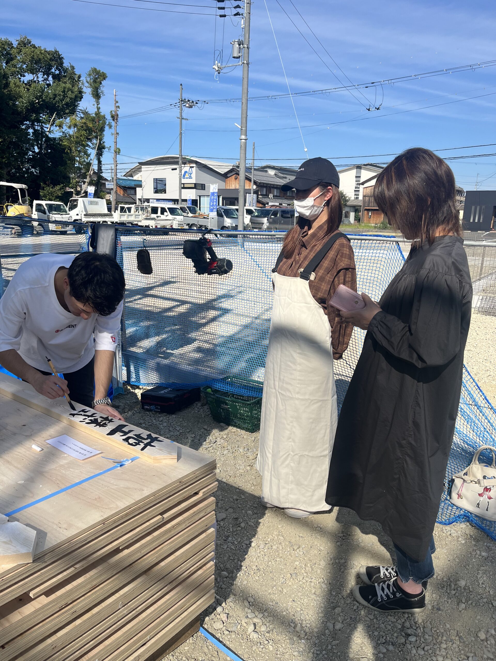 ご家族に見守られる中、棟上げ用の札に墨入れをして頂きます。さすが!本番に強い男です。練習用では心配していた文字の配分もうまく揃えて頂いて めちゃくちゃいい感じに仕上がりました。