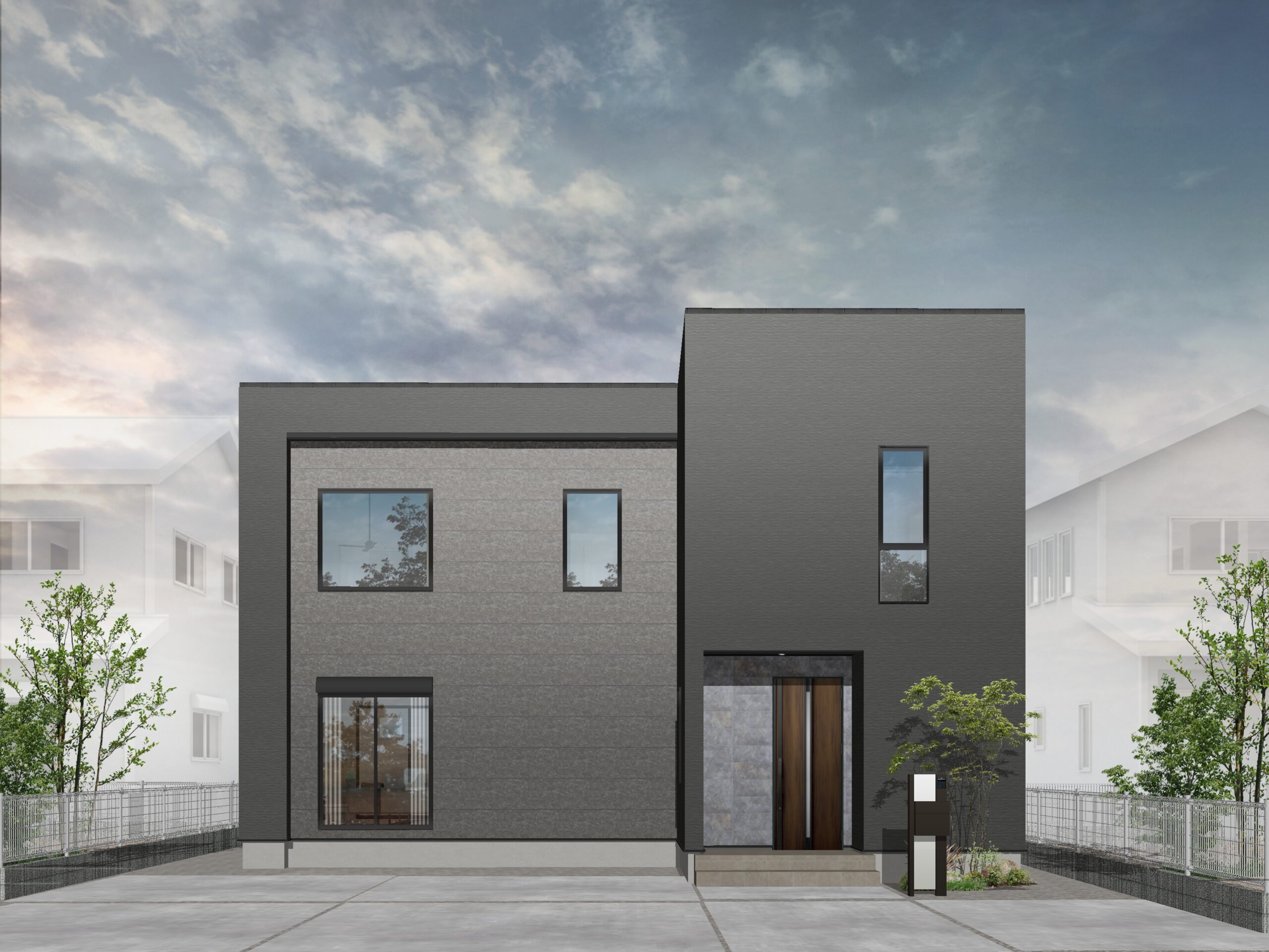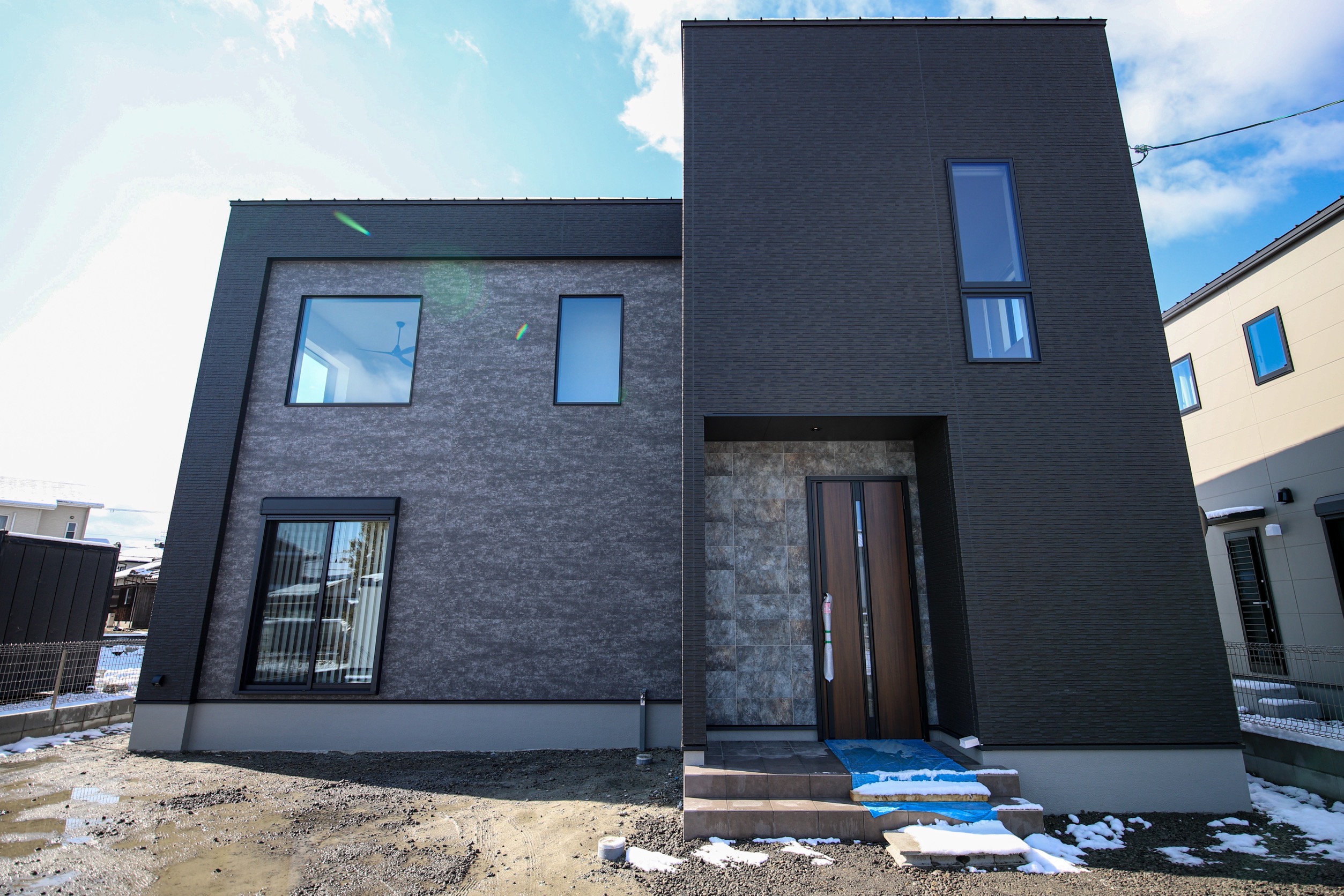 印象的なタイル柄をアクセントにしたスタイリッシュな邸宅。ワントーンの中に個性を光らせるこだわりのお家作りが現れた印象的な外観になりました。